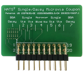 已获专利的HATS™单孔试样包含7个单孔通道。每个单孔通道可以替换成菊花链通道。该设计可以使得HATS™设备在试样上既能够从单孔又能够从菊花链测试通道上采集电阻值数据。设计师可以在试样上包括1或2个菊花链加上5到6个单孔。这提供了从从老数据到新变更之间的桥梁,并提供了看到单孔和菊花链通道之间测试结果不同的机会。